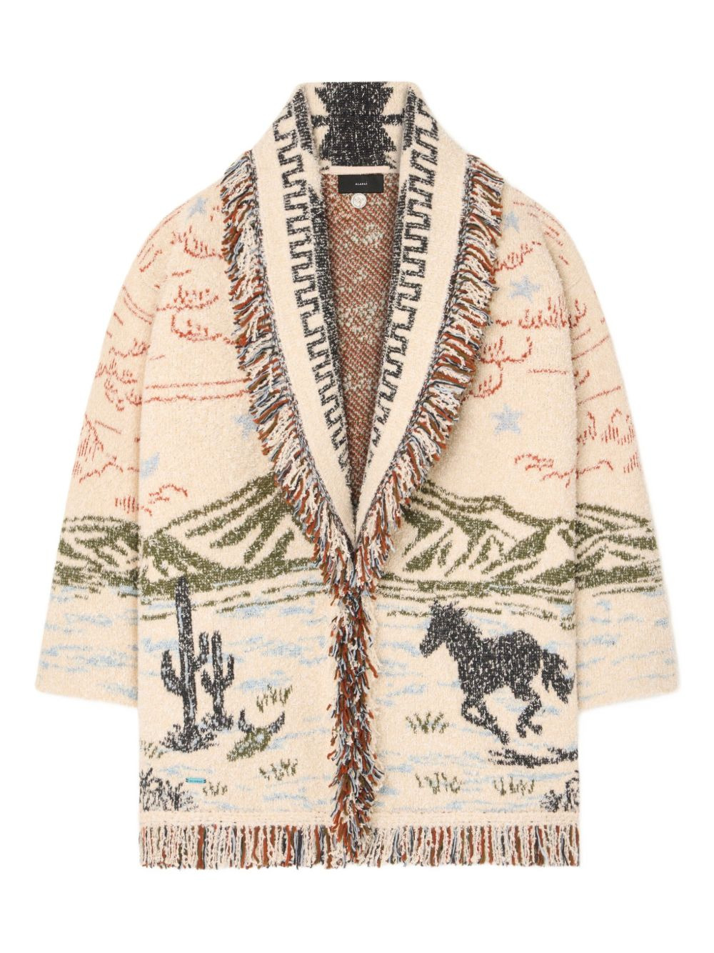 Sunset Riders cardigan Highlights - Beige - Belted waist - Patterned jacquard - Fringed edge - Shawl collar Made in Italy Composition Virgin Wool 70%, Cotton 19%, Polyamide 6%, Cashmere 5% Washing instructions Read Manufacturer Guidelines