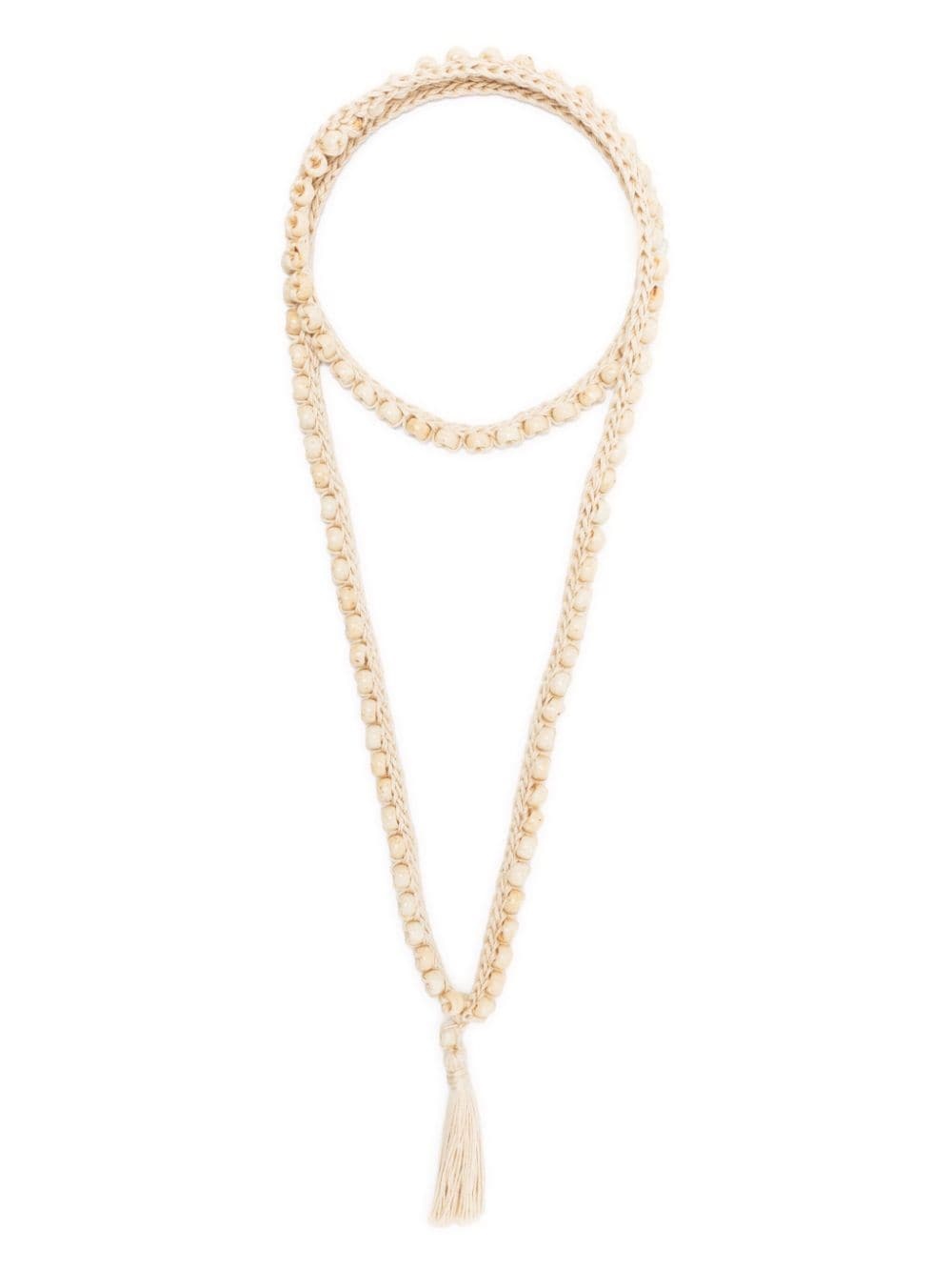 tassel detail crochet necklace Highlights - Beige - Cotton - Crochet knit - Tassel detail - Long length Made in Italy SIZE & FIT Model measurements Height 5 ft 11 in(1.8 m) Bust/Chest 31.49 in(80 cm) Hips 36.61 in(93 cm) Waist 24.4 in(62 cm) Measurement Length when open 48.81 in(124 cm) PENDANT LENGTH 2.36 in(6 cm) PENDANT WIDTH 0.55 in(1.4 cm) WIDTH 0.39 in(1 cm)