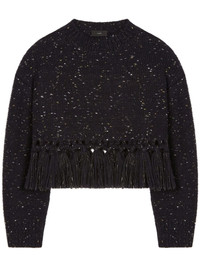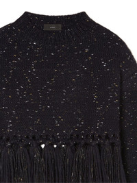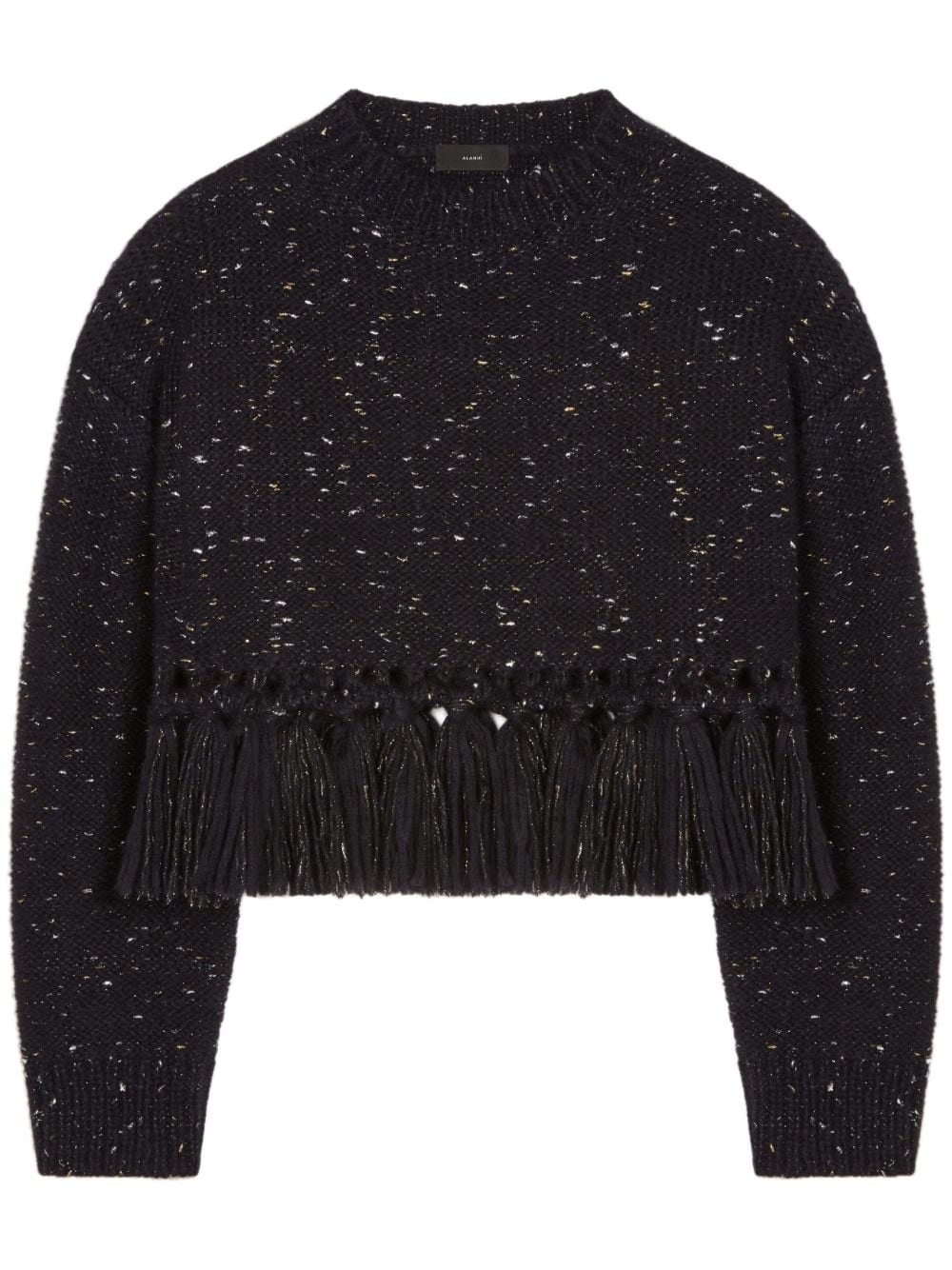 The Astral tasselled speckle-knit jumper Showcasing the brand's penchant for creative detailing, Alanui's Astral jumper is speckled with golden metallic threading meant to resemble a twinkling night sky. Tassels along the hem complete it. Highlights - Midnight blue - Speckle knit - Metallic threading - Tassel detail - Crew neck - Long sleeves - Straight hem Made in Italy Composition Alpaca 43%, Polyamide 33%, Viscose 13%, Wool 8%, Polyester 3%