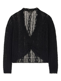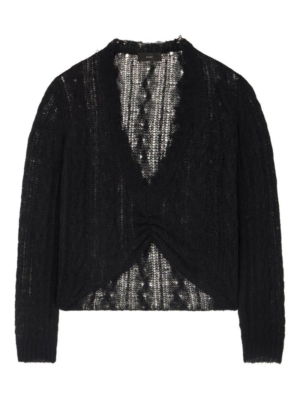 V-neck frayed-edge sweater Highlights - Black - V-neck - Frayed edges - Open knit - Twisted front detail - Long sleeves Made in Italy Composition Alpaca Wool 40%, Cashmere 30%, Fabric 30% Washing instructions Read Manufacturer Guidelines