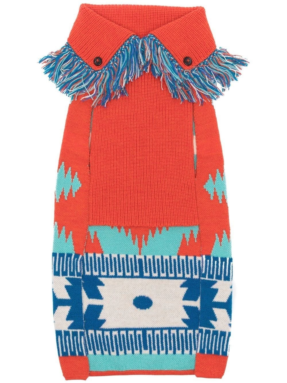x Poldo intarsia-knit dog jumper tiger lilly orange/sky blue virgin wool patterned intarsia knit ribbed-knit edge cut-out detailing fringe detailing pointed flat collar Made in Italy Composition Virgin Wool 100%