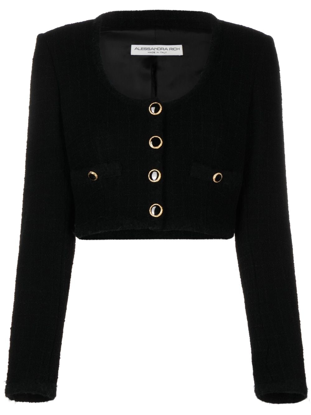 cropped boucle jacket Embodying the brand's contemporary take on retro design codes, this Alessandra Rich jacket is crafted to a cropped, scoop-neck silhouette from black boucle with oversized enamelled buttons traced in gold-tone metal. Highlights - Black - Virgin wool blend - Boucle construction - Enamel buttons - Gold-tone buttons - Scoop neck - Front button fastening - Long sleeves - Faux pocket detail - Cropped - Straight hem Made in Italy Composition Outer: Virgin Wool 84%, Polyamide 16% Lining: Viscose 100% SIZE & FIT Model measurements Height 5 ft 10 in(1.78 m) Bust/Chest 31.49 in(80 cm) Hips 35.03 in(89 cm) Waist 23.62 in(60 cm) Measurement CHEST 30.7 in(78 cm) SLEEVE LENGTH 22.83 in(58 cm) LENGTH 14.96 in(38 cm) FittingInformation Designed for a slim fit that sits just away from the body offering a close yet comfortable fit The internal shoulder pads offer a structured shape Made from a midweight non-stretch fabric This piece fits true to size – take your usual size Washing instructions Dry Clean Only