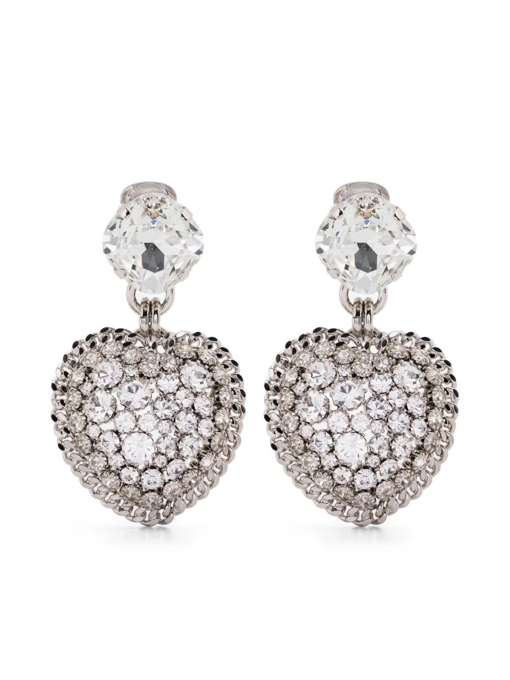 crystal-embellished heart-shape earrings Highlights - Silver-tone - Crystal embellishment - Heart-shape frame Made in Italy SIZE & FIT Model measurements Height 5 ft 11 in(1.8 m) Bust/Chest 31.49 in(80 cm) Hips 36.61 in(93 cm) Waist 24.4 in(62 cm) Measurement HEIGHT 2.55 in(6.5 cm) Weight (single earring) 23 g(23 g) WIDTH 1.45 in(3.7 cm)