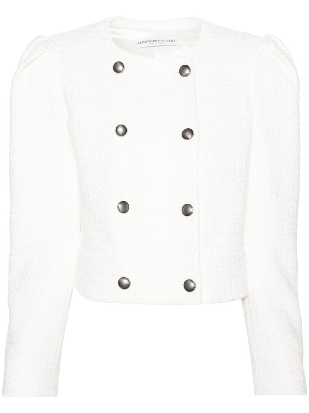 double-breasted boucle jacket Alessandra Rich presents this double-breasted jacket for their SS24 collection. Made with a boucle finish, its classic collarless style if distinguished by delicately gathered long sleeves. Highlights - White - Boucle construction - Pleat detailing - Round neck - Double-breasted button fastening - Long sleeves - Buttoned cuffs - Faux front welt pockets - Full lining - Straight hem - Cropped Made in Italy Composition Outer: Viscose 53%, Cotton 32%, Polyamide 15% Lining: Viscose 100% SIZE & FIT Model measurements Height 5 ft 9 in(1.76 m) Bust/Chest 31.1 in(79 cm) Hips 36.61 in(93 cm) Waist 24.8 in(63 cm) FittingInformation Designed to be unstructured, offering a loose fit throughout Made from a midweight non-stretch fabric This piece fits true to size – take your usual size Washing instructions Dry Clean Only