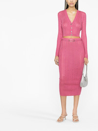 embellished knitted midi skirt This knitted midi skirt from Alessandra Rich speaks to the label’s motto of ‘dressing for pleasure’. The open-work construction is traced with tonal pink rhinestone embellishments. Highlights - Fuchsia pink - Knitted construction - Rhinestone embellishment - High waist - Below-knee length Made in Italy Composition glass 100%, Acetate 80%, Polyester 10%, Polyamide 10% SIZE & FIT Model measurements Height 5 ft 10 in(1.77 m) Bust/Chest 32.67 in(83 cm) Hips 35.43 in(90 cm) Waist 23.62 in(60 cm) FittingInformation Designed for a slim fit that sits just away from the body offering a close yet comfortable fit Made with a midweight knit, this piece offers some stretch This piece fits true to size – take your usual size Washing instructions Dry Clean Only