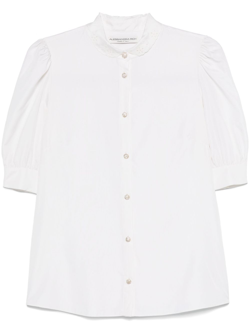 embroidered-collar silk shirt Highlights - White - Front button fastening - Buttoned cuffs - Rhinestone-embellished buttons - Short puff sleeves Made in Italy Composition Silk 100% SIZE & FIT Model measurements Height 5 ft 9 in(1.75 m) Bust/Chest 34.64 in(88 cm) Hips 36.61 in(93 cm) Waist 26.37 in(67 cm) FittingInformation Designed for a relaxed fit, this piece allows for comfort and movement when worn The dart stitching adds structure and a closer fit in the torso of this piece Made from a lightweight non-stretch fabric Washing instructions Dry Clean Only