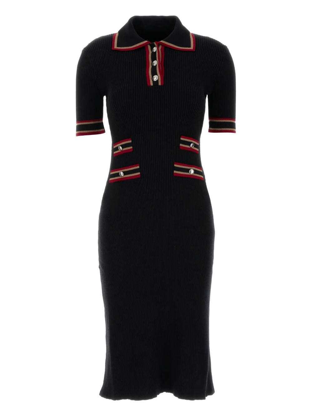 ribbed-knit polo-neck midi dress Highlights - Black - Ribbed knit - Short sleeves - Button placket - Striped trim Made in Italy Composition Virgin Wool 100% Washing instructions Read Manufacturer Guidelines