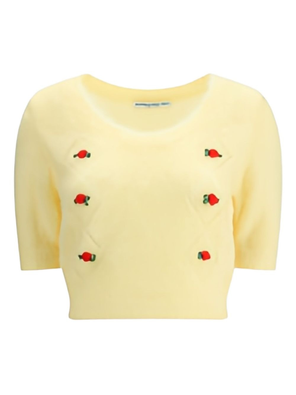 rose-embellished mohair top Highlights - Pale yellow - Mohair knit - Short sleeves - Rose embroidery - Diamond pattern - Round neck Made in Italy Composition Mohair 50%, Polyamide 32%, Wool 18% Washing instructions Read Manufacturer Guidelines