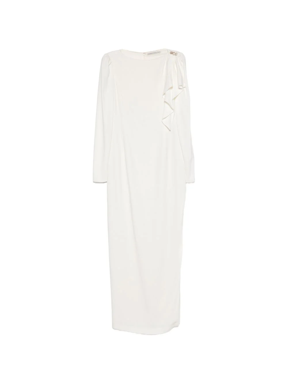 ruffled embellished midi dress Highlights - White - Ruffled detail - Long sleeves - Crew neck - Straight hem Made in Italy Composition Outer: glass 100%, Viscose 64%, Acetate 33%, Elastane 3% Lining: Polyamide 100%, Cupro 95%, Elastane 5% Washing instructions Dry Clean Only