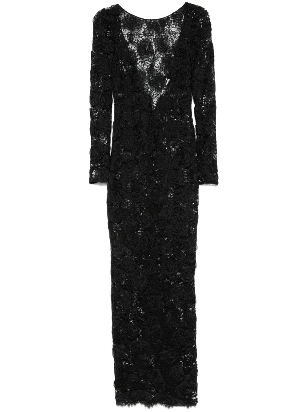 sequin-embellished floral-applique maxi dress Highlights - Black - Chantilly lace - Floral applique - Sequin embellishment - Concealed rear hook and zip fastening - Crew neck - Long sleeves - Buttoned cuffs - Dart detailing - V-back - Rear slit - Unlined - Straight hem - Long length Made in Italy Composition Silk 100%, Polyamide 39%, Polyester 35%, Cotton 13%, Viscose 13% SIZE & FIT Model measurements Height 5 ft 9 in(1.76 m) Bust/Chest 32.28 in(82 cm) Hips 35.43 in(90 cm) Waist 25.19 in(64 cm) FittingInformation Designed for a close fit throughout The internal bodice offers support and shape Made from a lightweight non-stretch fabric, this piece offers minimal elasticity when worn Washing instructions Do Not Wash/Do Not Dry Clean