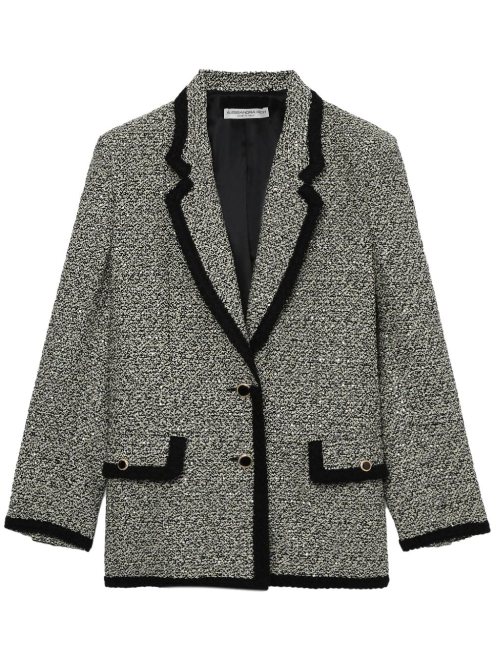 single-breasted tweed blazer Alessandra Rich pulls from retro sartorial references to create this single-breasted blazer. Tailored from melange tweed, a contrasting black trim elevates its notched lapel silhouette. Highlights - Grey - Cotton blend - Tweed - Melange effect - Contrasting border - Notched lapels - Front button fastening - Long sleeves - Buttoned cuffs - Two front flap pockets - Straight hem Made in Italy Composition Outer: Cotton 71%, Polyester 18%, Polyamide 11% Lining: TENCEL™ 100%