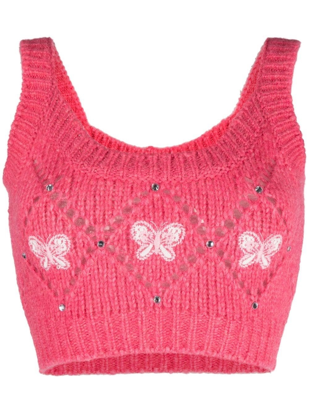 sleeveless knitted top Alessandra Rich's knitted top honours the brand's romantic aesthetic. This fuchsia pink iteration is spun from an alpaca wool blend with crystal glass embellishments and delicate embroidered detailing. Made in Italy Composition glass 100%, Alpaca Wool 68%, Polyamide 22%, Wool 10% SIZE & FIT Model measurements Height 5 ft 10 in(1.77 m) Bust/Chest 32.67 in(83 cm) Hips 35.43 in(90 cm) Waist 23.62 in(60 cm) FittingInformation This piece fits true to size. We recommend you get your regular size Cut for a close fit Made with a mid-weight fabric Washing instructions Dry Clean Only