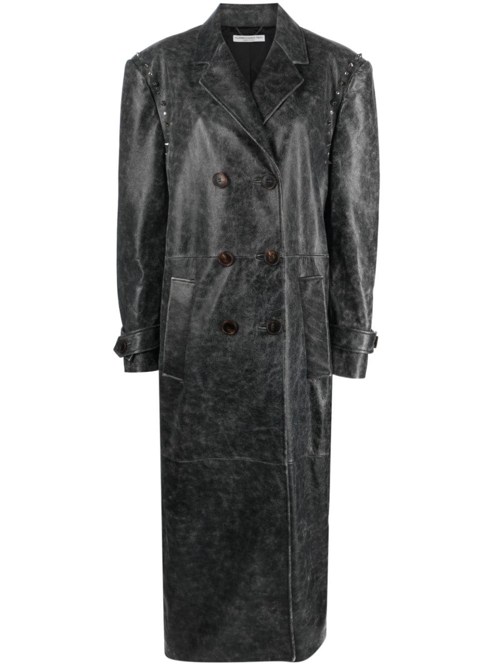 studded leather coat Impactful in both cut and detailing, this grey Alessandra Rich coat is crafted from faded leather to an oversized silhouette with silver-tone studs at the strong shoulders – a combination that nods to the brand’s underground ‘80s inspirations. Highlights - Dark grey - Lambskin - Distressed finish - Stud detailing - Notched lapels - Double-breasted button fastening - Long sleeves - Belted cuffs - Two side welt pockets - Central rear vent Made in Italy Composition Polyurethane 100% SIZE & FIT Model measurements Height 5 ft 10 in(1.77 m) Bust/Chest 29.92 in(76 cm) Hips 34.25 in(87 cm) Waist 23.62 in(60 cm)
