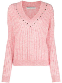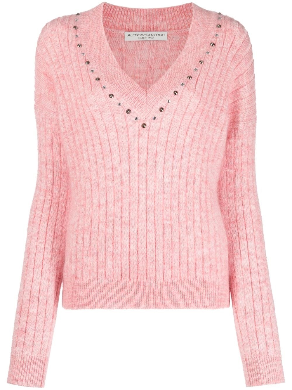 stud-embellished ribbed jumper Alessandra Rich elevates a classic knitted design with edgy detailing. This ribbed jumper, spun from a blend of pink virgin wool, is adorned with studs along the neckline for a playful twist. Highlights - Rose pink - Virgin wool blend - Ribbed knit - Stud detailing - V-neck - Long sleeves - Straight hem Made in Italy Composition Virgin Wool 50%, Wool 30%, Polyamide 20% SIZE & FIT Model measurements Height 5 ft 10 in(1.79 m) Bust/Chest 31.49 in(80 cm) Hips 35.03 in(89 cm) Waist 23.62 in(60 cm) FittingInformation Designed for a slim fit that sits just away from the body offering a close yet comfortable fit The ribbed hem offers a close, comfortable fit Made with a midweight knit, this piece offers some stretch This piece fits true to size – take your usual size