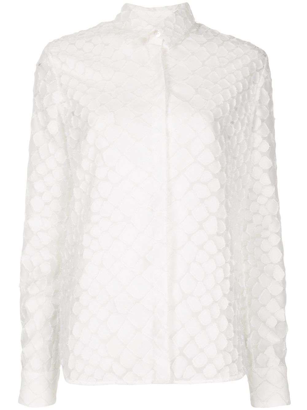 Ashton textured long sleeve shirt White Ashton textured long sleeve shirt from Alex Perry featuring a pointed collar and a concealed front button placket. Imported Composition Nylon 100%, Polyester 100% SIZE & FIT Model measurements Height 5 ft 9 in(1.76 m) Bust/Chest 29.13 in(74 cm) Hips 33.07 in(84 cm) Waist 22.83 in(58 cm) FittingInformation This piece fits true to size. We recommend you get your regular size Cut for a loose fit Made with a mid-weight non-stretch fabric Washing instructions Dry Clean Only