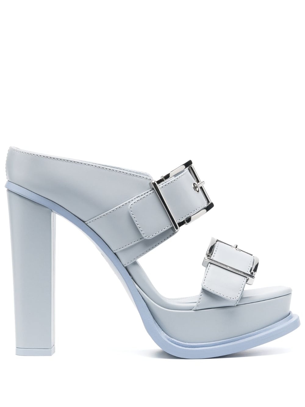 120mm leather sandals Alexander McQueen presents these bold mules for SS23 in a delicate blue hue, offering a soft touch to the statement platform design. Highlights - Powder blue - Calf leather - Silver-tone hardware - Open toe - Side buckle fastening - Branded footbed - High block heel - Platform sole Made in Italy Composition Sole: Calf Leather 100% Lining: Calf Leather 100% Outer: Calf Leather 100% SIZE & FIT Measurement HEEL 4.72 in(12 cm) PLATFORM 1.18 in(3 cm)