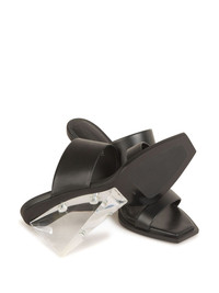 75mm leather sandals Highlights - Black - Calf leather - Slip-on style - 75mm translucent platform wedge - Open back - Double-strap design - Square open toe - Branded leather insole - Rubber outsole Made in Italy Composition Outer: Calf Leather 100% Lining: Calf Leather 100% Sole: Calf Leather 100%, Rubber 100%, Plexiglass 100% SIZE & FIT Measurement HEEL 2.95 in(7.5 cm)