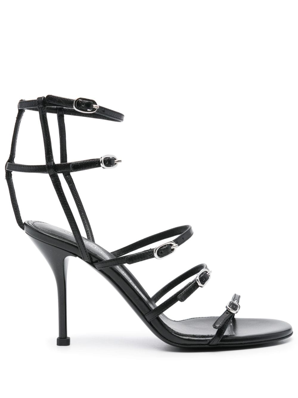 95mm leather sandals Highlights - Black - Calf leather - Almond open toe - Cut-out detailing - Branded leather insole - Leather sole - 95mm high stiletto heel - Side buckle fastening Made in Italy Composition Outer: Calf Leather 100% Sole: Calf Leather 100%, Rubber 100% Lining: Calf Leather 100% SIZE & FIT Measurement CIRCUMFERENCE 7.48 in(19 cm) HEEL 3.74 in(9.5 cm) HEIGHT 3.54 in(9 cm)