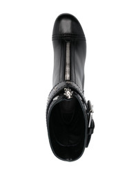 buckle-detail 90mm leather boots Capturing Alexander McQueen's love for punk-inspired aesthetics, these leather boots are decorated with an expressive buckle, as well as contrasting silver-tone details. Resting atop 90mm stiletto heels, the pair fastens with an exposed front zip. Highlights - Black - Calf leather - Silver-tone hardware - Decorative buckle detailing - Round toe - Front zip fastening - Branded insole - Stiletto heel - Leather sole Made in Italy Composition Sole: Calf Leather 100%, Rubber 100% Outer: Calf Leather 100% Lining: Calf Leather 100% SIZE & FIT Measurement CIRCUMFERENCE 9.44 in(24 cm) HEEL 3.54 in(9 cm) HEIGHT 6.29 in(16 cm) Sole height 0.39 in(1 cm)
