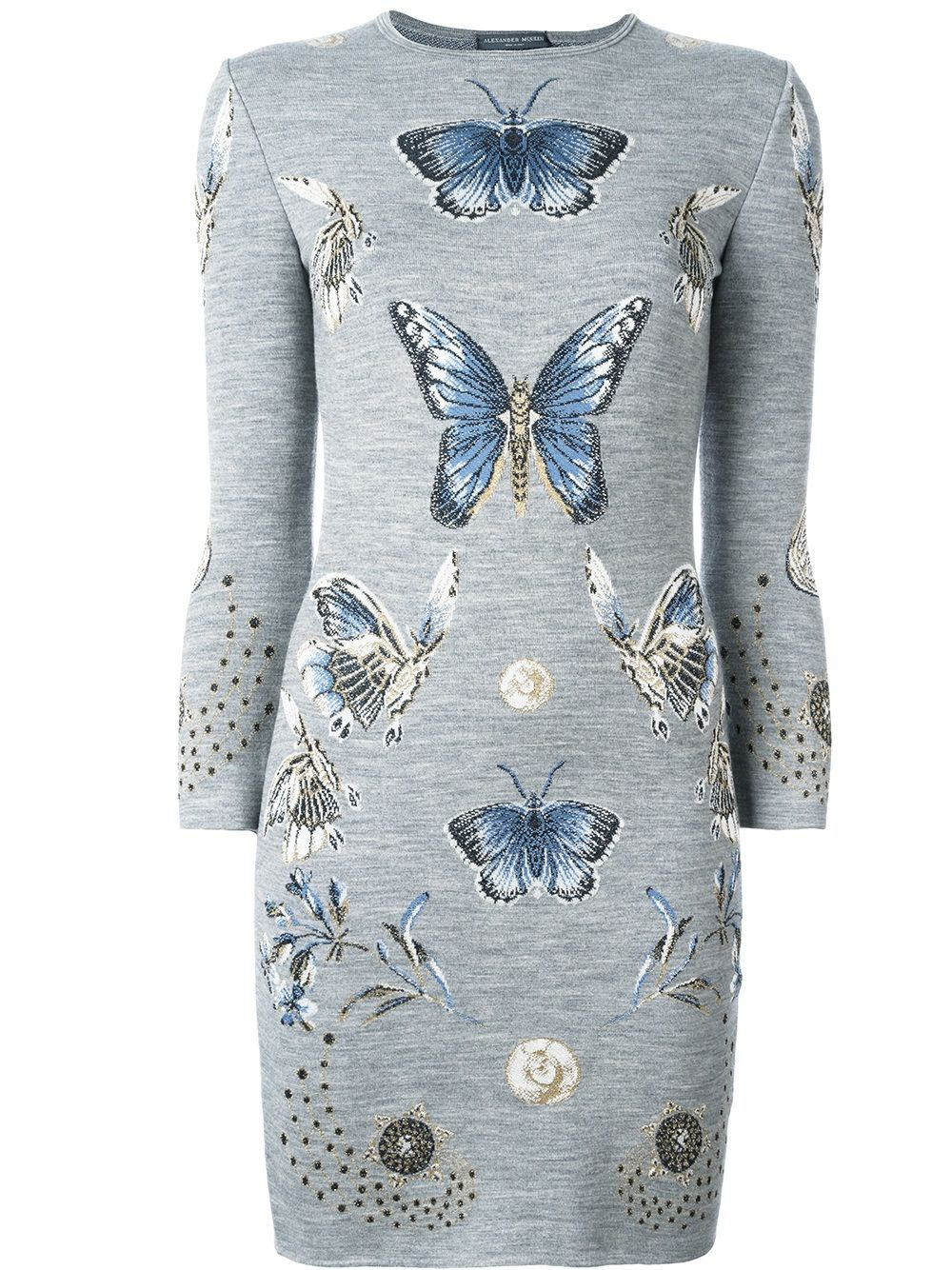 butterfly jacquard knit dress Grey wool-silk blend butterfly jacquard knit dress from Alexander McQueen featuring a round neck, a fitted silhouette, long sleeves, a short length and a straight hem. Made in Italy Composition Outer: Wool 40%, Silk 26%, Polyamide 11%, Viscose 10%, Metallic Fibre 6%, Polyester 5%, Spandex/Elastane 2% SIZE & FIT Model measurements Height 5 ft 9 in(1.76 m) Bust/Chest 29.92 in(76 cm) Hips 34.64 in(88 cm) Waist 24.01 in(61 cm) Washing instructions Dry Clean Only