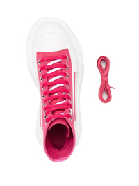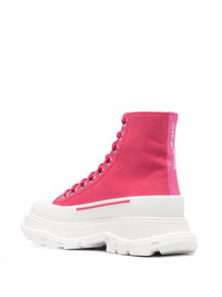 Tread Slick boots An exemplar of Alexander McQueen's penchant for chunky sneakers, this hot pink pair sits atop bright white flatform soles for a finish that's sure to soar your everyday ensembles to dizzying new heights. Highlights - Pink - Ankle-length - Round toe - Front lace-up fastening - Branded insole - Chunky rubber sole Made in Italy Composition Cotton 100% SIZE & FIT Measurement HEEL 1.96 in(5 cm) HEIGHT 4.33 in(11 cm) Sole height 1.18 in(3 cm)