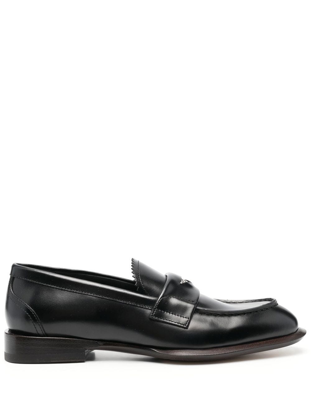 coin-embellished penny loafers Crafted from polished calf leather, these loafers from Alexander McQueen feature a decorative strap neatly accented with the brand's ‘Seal’ engraving. The zig-zag edge and black and brown flat sole add a contemporary twist to this timeless silhouette. Highlights - Black - Calf leather - Polished finish - Stitched-fold detailing - Silver-tone hardware - Zigzag edge - Penny slot - Almond toe - Branded leather insole - Flat rubber sole Made in Italy Composition Sole: Rubber 100%, Calf Leather 100% Outer: Calf Leather 100% Lining: Calf Leather 100% SIZE & FIT Measurement HEEL 0.98 in(2.5 cm) Sole height 0.39 in(1 cm)