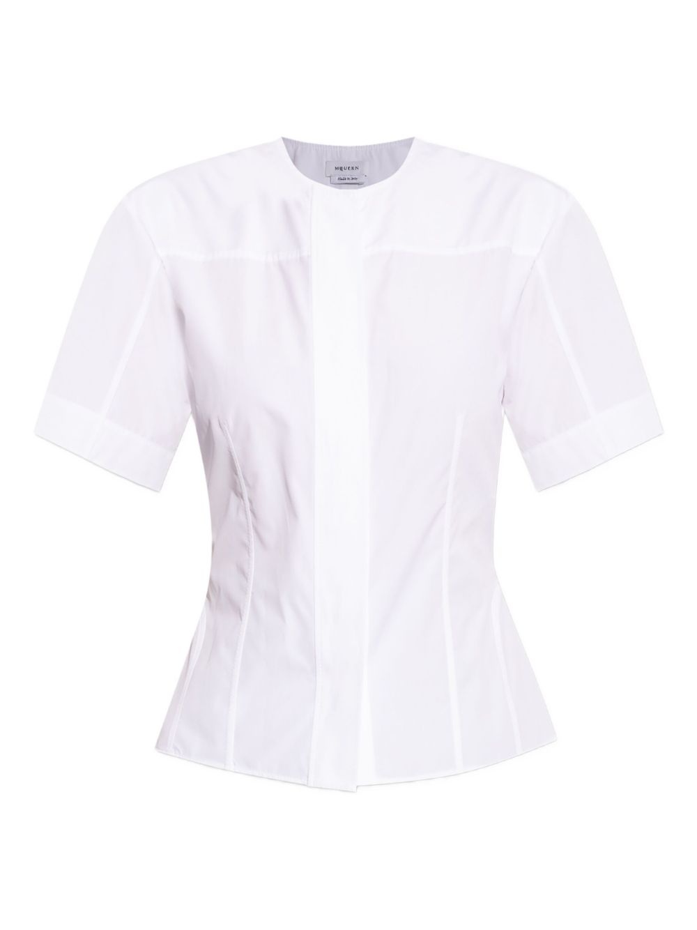 cotton short sleeve top Highlights - White - Crew neck - Shorts sleeves - Front concealed fastening - Curved hem Made in Italy Composition Cotton 100% Washing instructions Read Manufacturer Guidelines