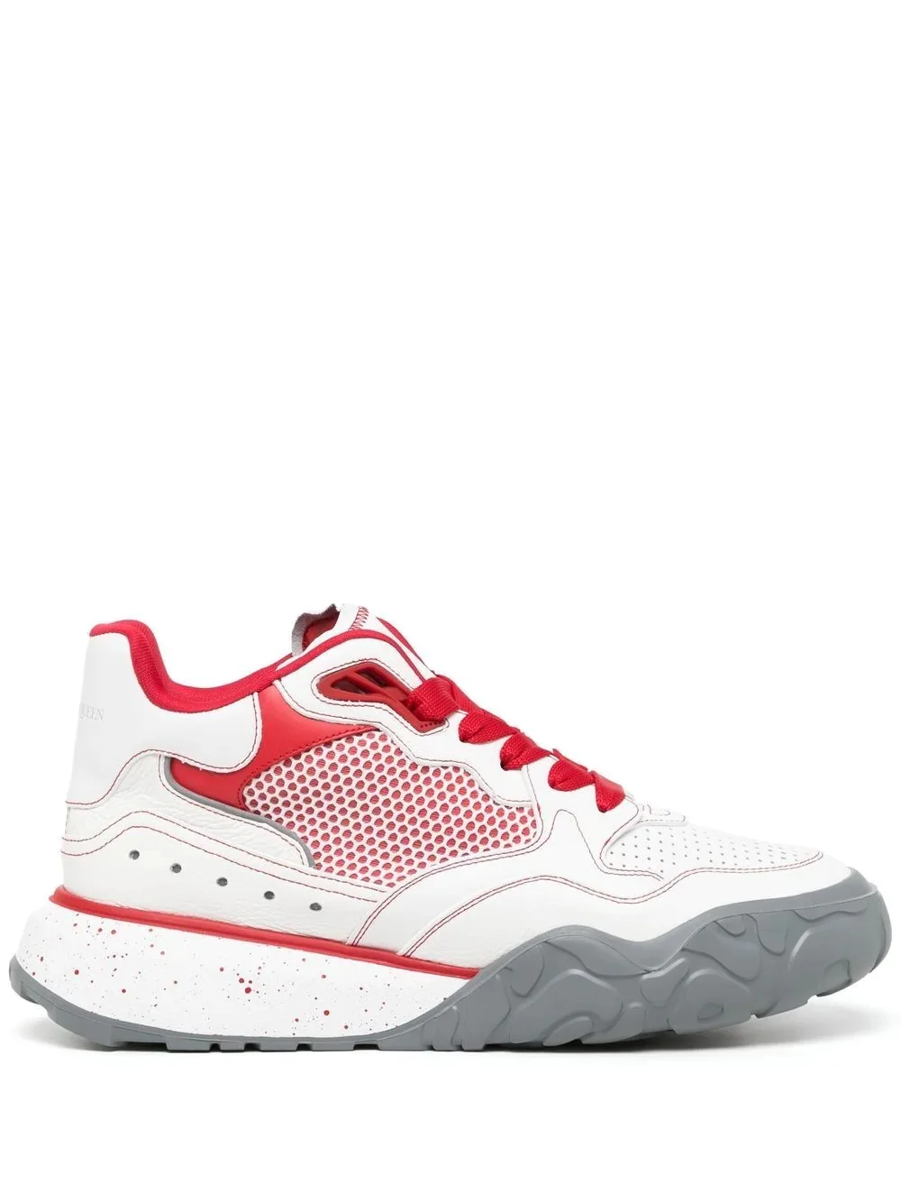 Court Trainer chunky sneakers Alexander McQueen's Court Trainer sneakers get their distinctive look from the panelled design and chunky rubber sole. Crafted from leather, this iteration arrives in a white, red and grey colourway. Made in Italy Composition Outer: Leather 100% Lining: Polyester 100% Sole: Rubber 100% SIZE & FIT Measurement CIRCUMFERENCE 9.44 in(24 cm) HEEL 1.96 in(5 cm) HEIGHT 3.54 in(9 cm) Sole height 1.18 in(3 cm)