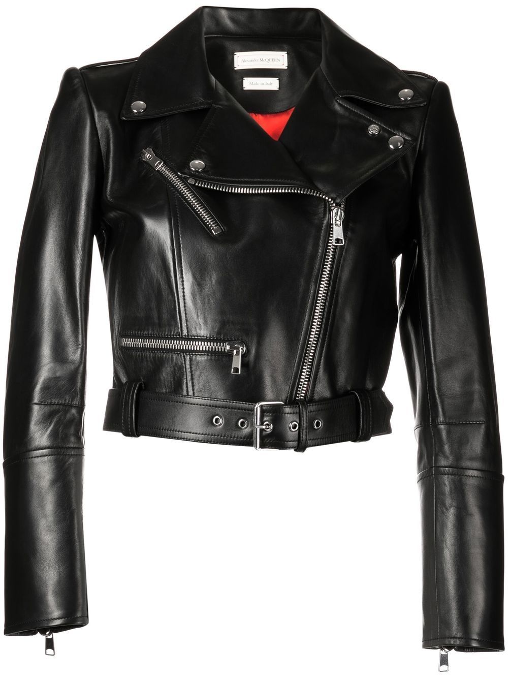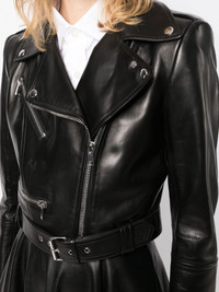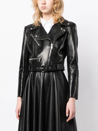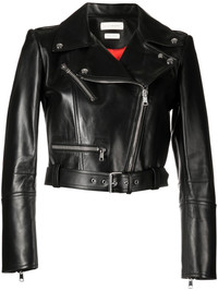 cropped leather jacket Displaying its signature dramatic aesthetic, Alexander McQueen presents its own iteration of the classic biker jacket. Maintaining the classic black leather construction and off-centre fastening, this piece is modernised with a cropped silhouette. Made in Italy Composition Lamb Skin 100% SIZE & FIT Model measurements Height 5 ft 9 in(1.76 m) Bust/Chest 29.92 in(76 cm) Hips 35.82 in(91 cm) Waist 25.98 in(66 cm) FittingInformation This piece fits true to size. We recommend you get your regular size Cut for a loose fit Made with a mid-weight fabric Washing instructions Dry Clean Only