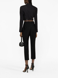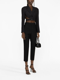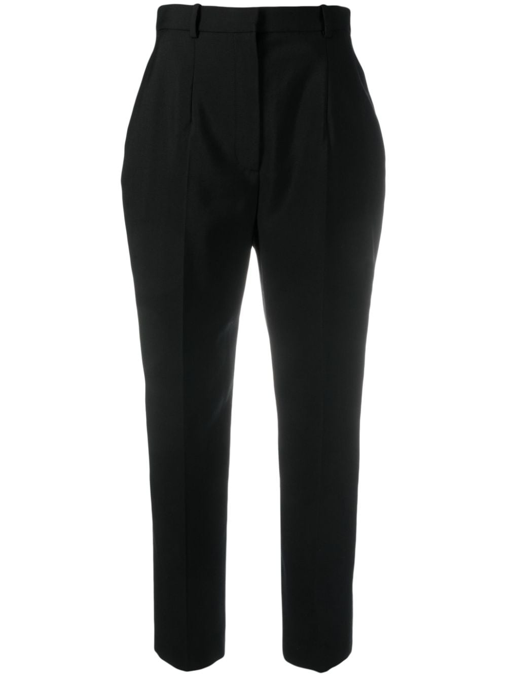 cropped wool trousers Alexander McQueen’s affinity for tailoring is reflected by these black trousers. Cut from wool to a cropped silhouette, they’re structured to a tapered leg. Highlights - Black - Wool - Slim cut - High-waisted - Belt loops - Concealed front fastening - Cropped leg Made in Italy Composition Lining: Cupro 100% Outer: Wool 100% SIZE & FIT Model measurements Height 5 ft 10 in(1.79 m) Bust/Chest 31.1 in(79 cm) Hips 35.03 in(89 cm) Waist 24.01 in(61 cm) Measurement INSIDE LEG 25.98 in(66 cm) Hem Width 10 in(25.4 cm) FRONT RISE 12 in(30.5 cm) WAIST 24.01 in(61 cm) BACK RISE 13.5 in(34.3 cm) HIPS 32 in(81.3 cm) FittingInformation Designed for a tapered fit, these trousers allow for a close fit at the waist and a loose unrestricted fit over the leg with a closer fit towards the ankle Made from a midweight non-stretch fabric This piece fits true to size – take your usual size