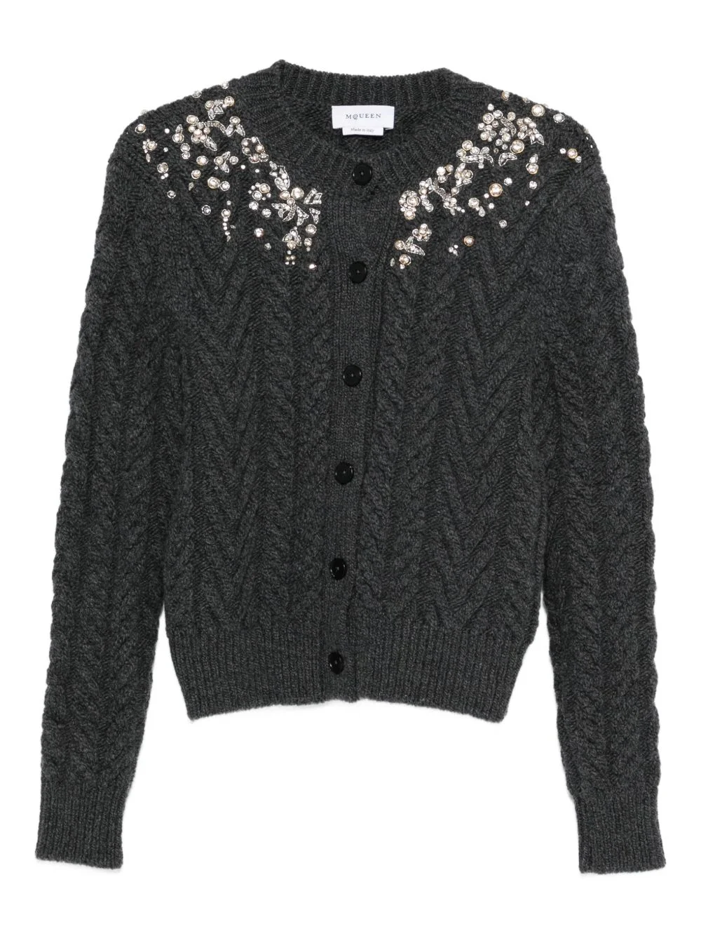 crystal cable-knit cardigan Highlights - Dark grey - Cable knit - Crystal embellishment - Round neck - Button fastening - Long sleeves Made in Italy Composition Wool 90%, Cashmere 10% SIZE & FIT Model measurements Height 5 ft 10 in(1.78 m) Bust/Chest 31.49 in(80 cm) Hips 37 in(94 cm) Waist 23.62 in(60 cm) Washing instructions Dry Clean Only
