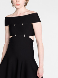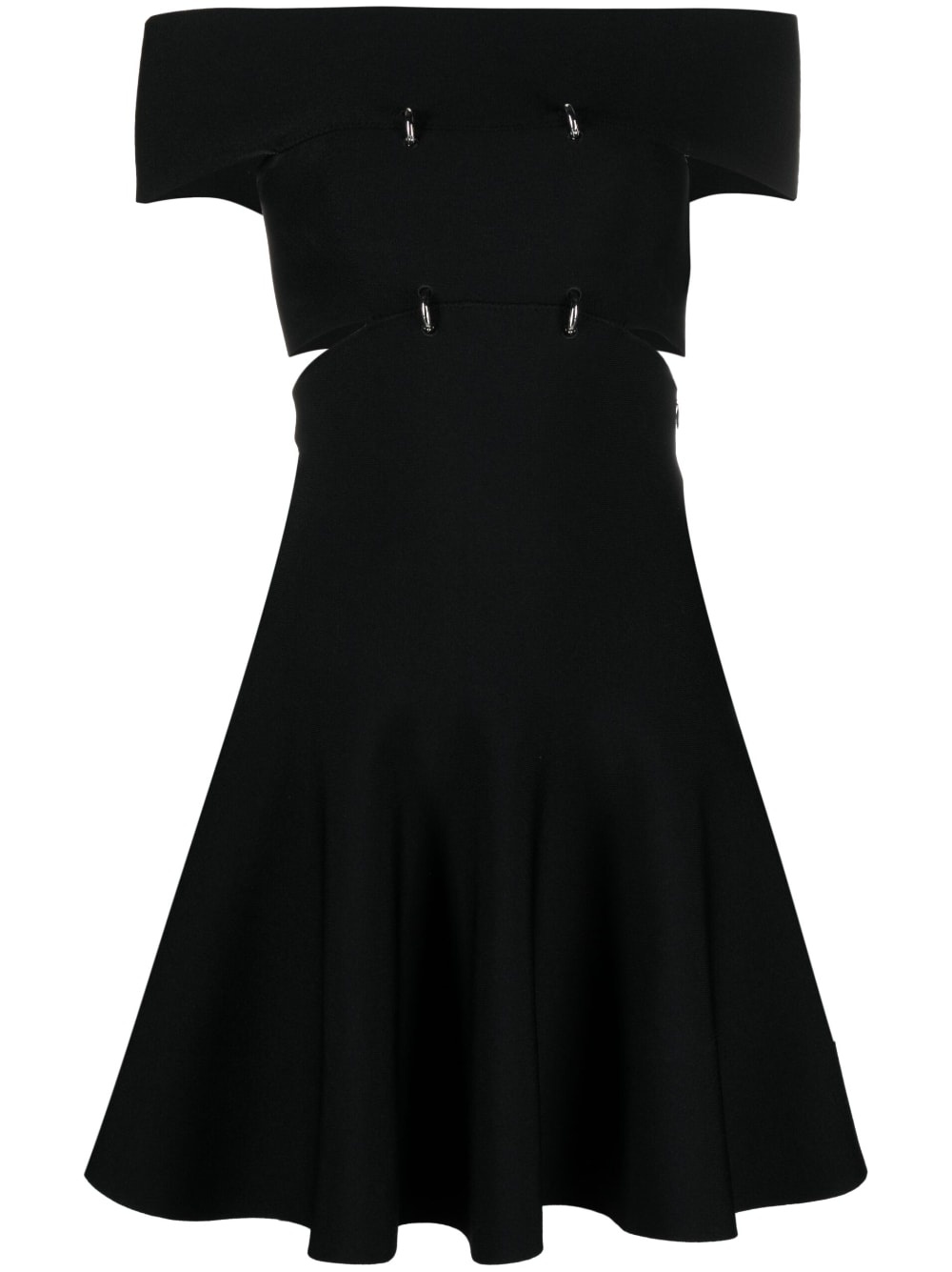 off-shoulder flared mini dress This Alexander McQueen dress features slashed cut-outs and eyelet details for an edgier look. Complete with a ribbed-knit finish and flared mini skirt. Highlights - Black - Stretch-design - Cut-out detailing - Silver-tone hardware - Off-shoulder - Flared skirt Made in Italy Composition Viscose 79%, Polyester 15%, Polyamide 5%, Spandex/Elastane 1% SIZE & FIT Model measurements Height 5 ft 10 in(1.78 m) Bust/Chest 32.28 in(82 cm) Hips 36.61 in(93 cm) Waist 25.98 in(66 cm) Measurement LENGTH 30.31 in(77 cm) WAIST 23.62 in(60 cm) HIPS 33.07 in(84 cm) FittingInformation Designed for a close fit at the chest and waist with a loose fit at the hip Made with a midweight knit, this piece offers some stretch This piece fits true to size – take your usual size Washing instructions Dry Clean Only