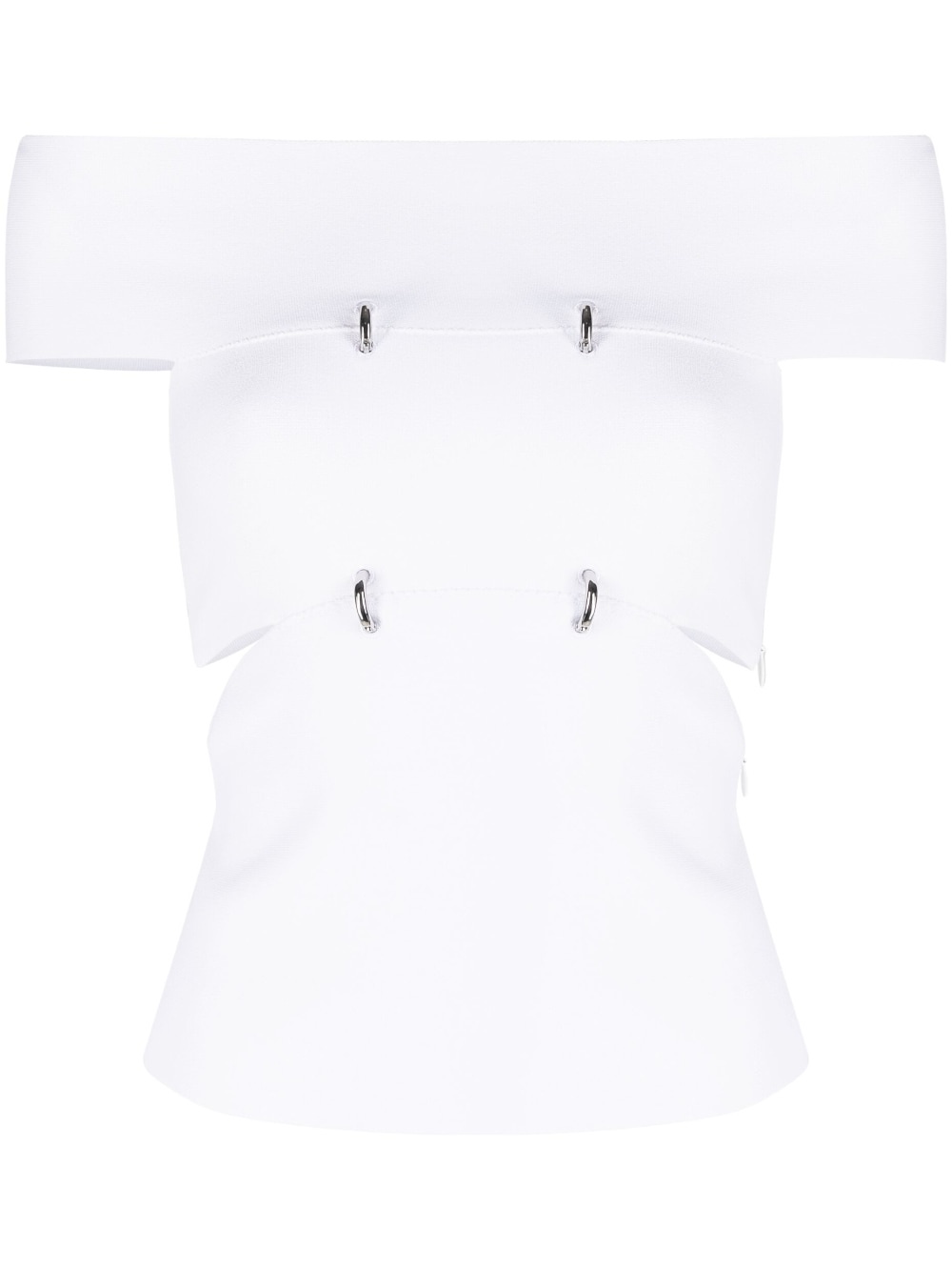 cut-out off-shoulder top Known for its creative designs with punk-rock inspiration, Alexander McQueen presents this top for his SS23 collection. With a straight off-the-shoulder silhouette, this piece is adorned cut-out detailing and ring embellishments that seem to connect the parts of the garment. Highlights - Optical white - Stretch-design - Off-shoulder - Cut-out detailing - Ring embellishment - Silver-tone hardware - Concealed side zip fastening Made in Italy Composition Viscose 79%, Polyester 15%, Polyamide 5%, Elastane 1% SIZE & FIT Model measurements Height 5 ft 10 in(1.77 m) Bust/Chest 32.67 in(83 cm) Hips 35.43 in(90 cm) Waist 23.62 in(60 cm) FittingInformation Designed for a close fit throughout Made with a midweight knit, this piece offers some stretch This piece fits true to size – take your usual size Washing instructions Dry Clean Only