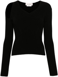 cut out-detail sweater Alexander McQueen takes a shot on minimalism with this ribbed jumper. Crafted from a blend of wool, it boasts a cut-out at one of the shoulders for a subtle contemporary touch. Highlights - Black - Wool blend - Ribbed knit - V-neck - Cut-out detailing - Long sleeves - Straight hem Made in Italy Composition Wool 95%, Polyester 5% SIZE & FIT Model measurements Height 5 ft 10 in(1.77 m) Bust/Chest 32.28 in(82 cm) Hips 35.03 in(89 cm) Waist 25.19 in(64 cm) Measurement SLEEVE LENGTH 25.51 in(64.8 cm) LENGTH 20.51 in(52.1 cm) WAIST 20 in(50.8 cm) BUST 27.99 in(71.1 cm) FittingInformation Designed for a slim fit that sits just away from the body offering a close yet comfortable fit Made with a midweight knit, this piece offers some stretch This piece fits true to size – take your usual size Washing instructions Dry Clean Only