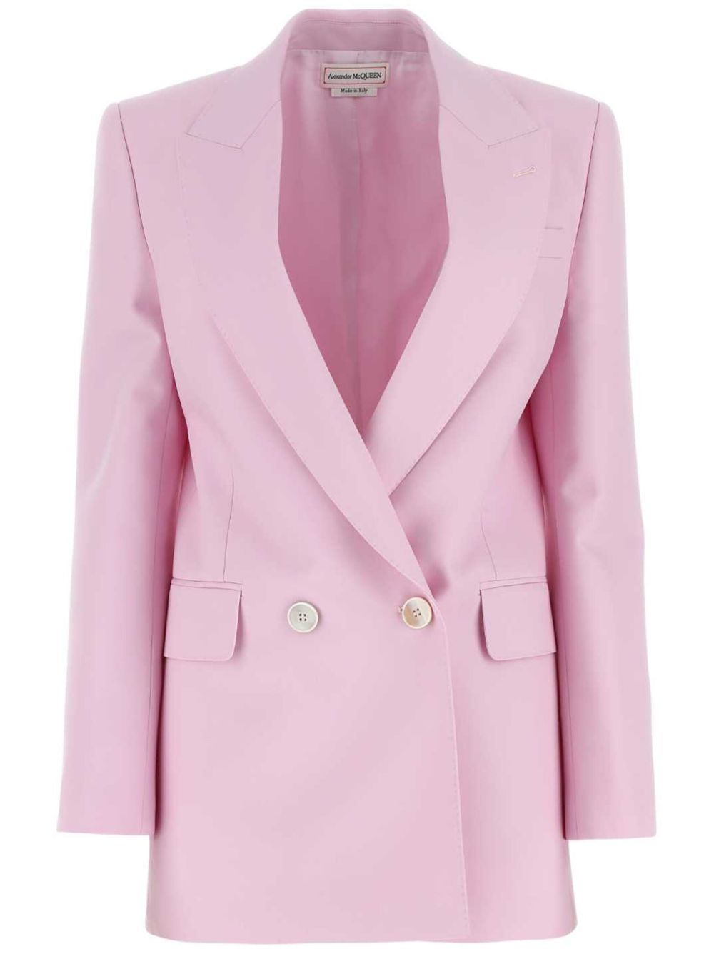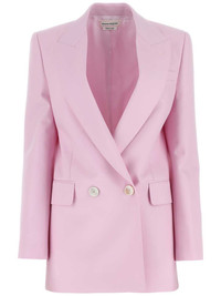 double-breasted wool blazer Reflecting the British label's famed tailoring, Alexander McQueen presents this boxy blazer. Expertly crafted from 'porcelain' wool, this double-breasted iteration features wide peak lapels and padded shoulders. Highlights - Light pink - Wool - Peak lapels - Shoulder pads - Long sleeves - Buttoned cuffs - Chest welt pocket - Two side flap pockets - Full lining - Straight hem - Double-breasted button fastening Made in Italy Composition Lining: Cupro 100% Outer: Wool 100% SIZE & FIT FittingInformation Designed for a slim fit that sits just away from the body offering a close yet comfortable fit The internal shoulder pads offer a structured shape Made from a midweight non-stretch fabric This piece fits true to size – take your usual size