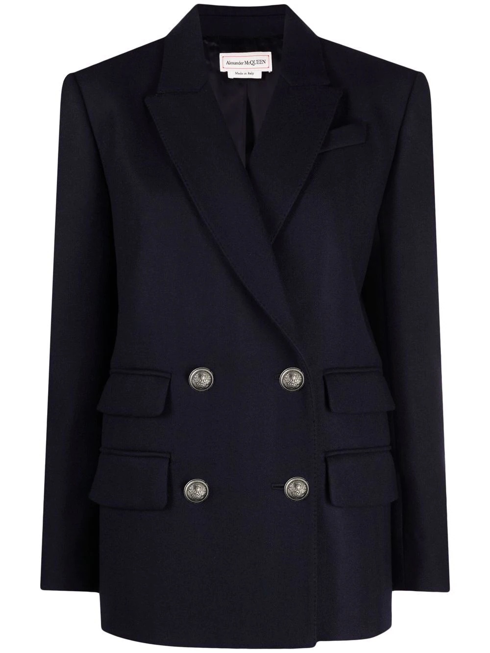 double-breasted wool-blend blazer navy wool-blend peak lapels double-breasted button fastening shoulder pads long sleeves buttoned cuffs chest welt pocket four side flap pockets American rear vent Made in Italy Composition Outer: Wool 99%, Cashmere 1% Lining: Cupro 100% SIZE & FIT Model measurements Height 5 ft 10 in(1.78 m) Bust/Chest 31.1 in(79 cm) Hips 33.85 in(86 cm) Waist 24.01 in(61 cm) FittingInformation This piece fits true to size. We recommend you get your regular size Cut for a loose fit Made with a mid-weight non-stretch fabric Washing instructions Dry Clean Only