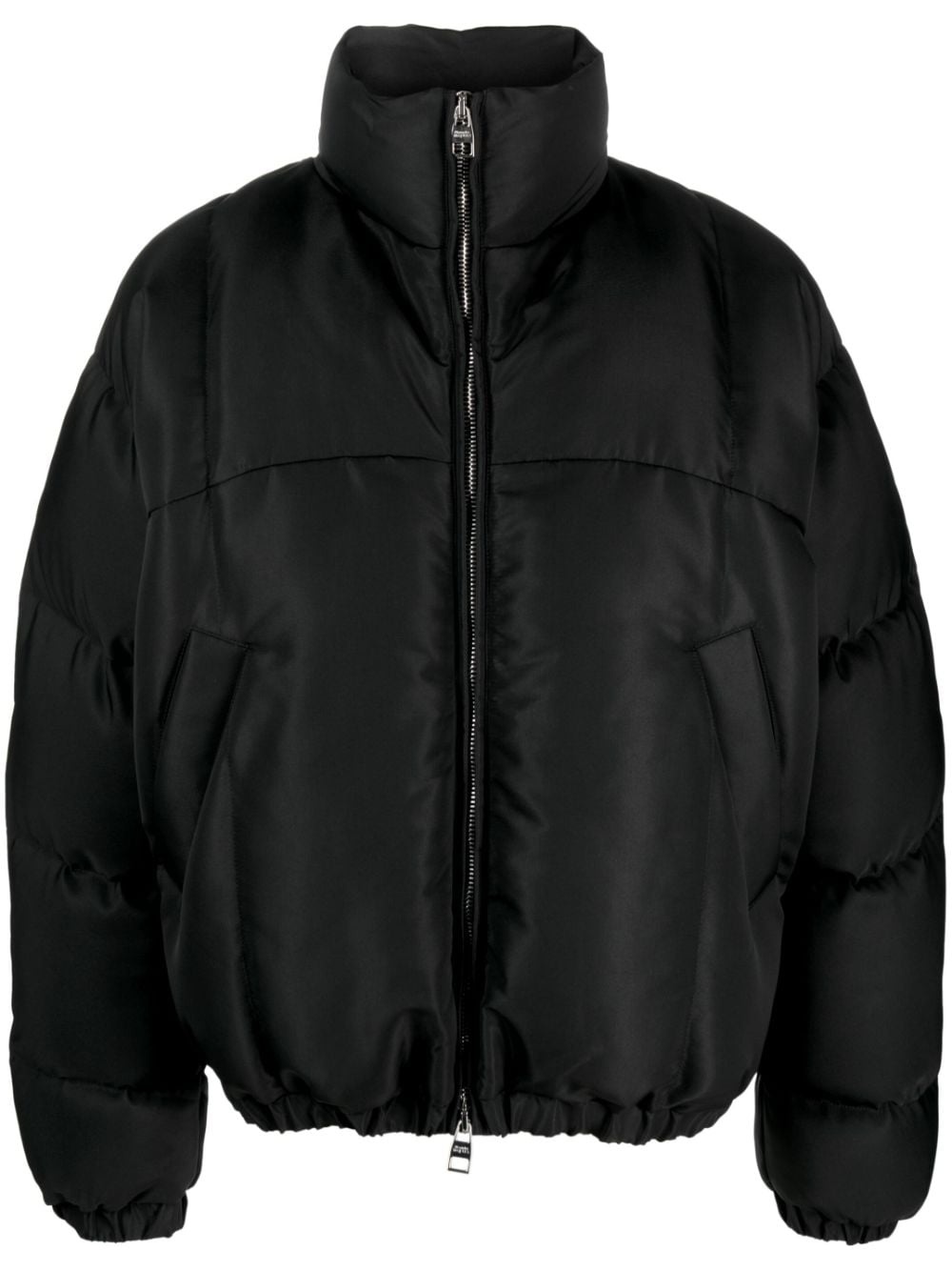 funnel-neck padded jacket Alexander McQueen's padded jacket is fitted with a funnel neck and embroidered with a logo on the rear. Highlights - Black - Padded design - Embroidered logo to the rear - Funnel neck - Long sleeves - Rear two-way zip fastening - Two side inset pockets - Elasticated cuffs and hem - Straight hem Made in Italy Composition Outer: Polyester 100% Lining: Polyester 100% SIZE & FIT Model measurements Height 6 ft 2 in(1.89 m) Bust/Chest 38.97 in(99 cm) Hips 38.18 in(97 cm) Waist 32.28 in(82 cm) FittingInformation Designed to be unstructured, offering a loose fit throughout The elasticated hem allows for movement and a comfortable fit Made from a padded non-stretch fabric, giving it no natural elasticity This piece fits true to size – take your usual size Washing instructions Dry Clean Only