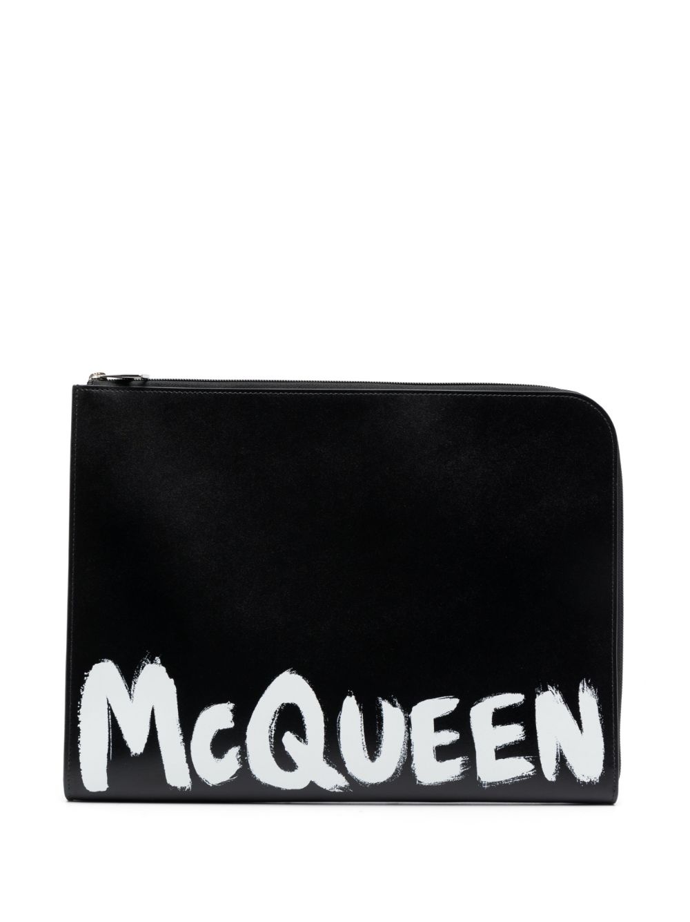 Graffiti logo-print clutch Alexander McQueen's clutch is emblazoned with 'McQueen' at the front in a graffiti style. The contrasting white letters pop against the black background. Highlights - Black - Calf leather - Graffiti logo print - Top zip fastening Made In Italy Composition Outer: Calf Leather 100% SIZE & FIT Model measurements Height 6 ft 2 in(1.88 m) Bust/Chest 36.61 in(93 cm) Hips 35.82 in(91 cm) Waist 27.95 in(71 cm) Measurement DEPTH 0.78 in(2 cm) HEIGHT 11.02 in(28 cm) WIDTH 14.17 in(36 cm)