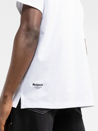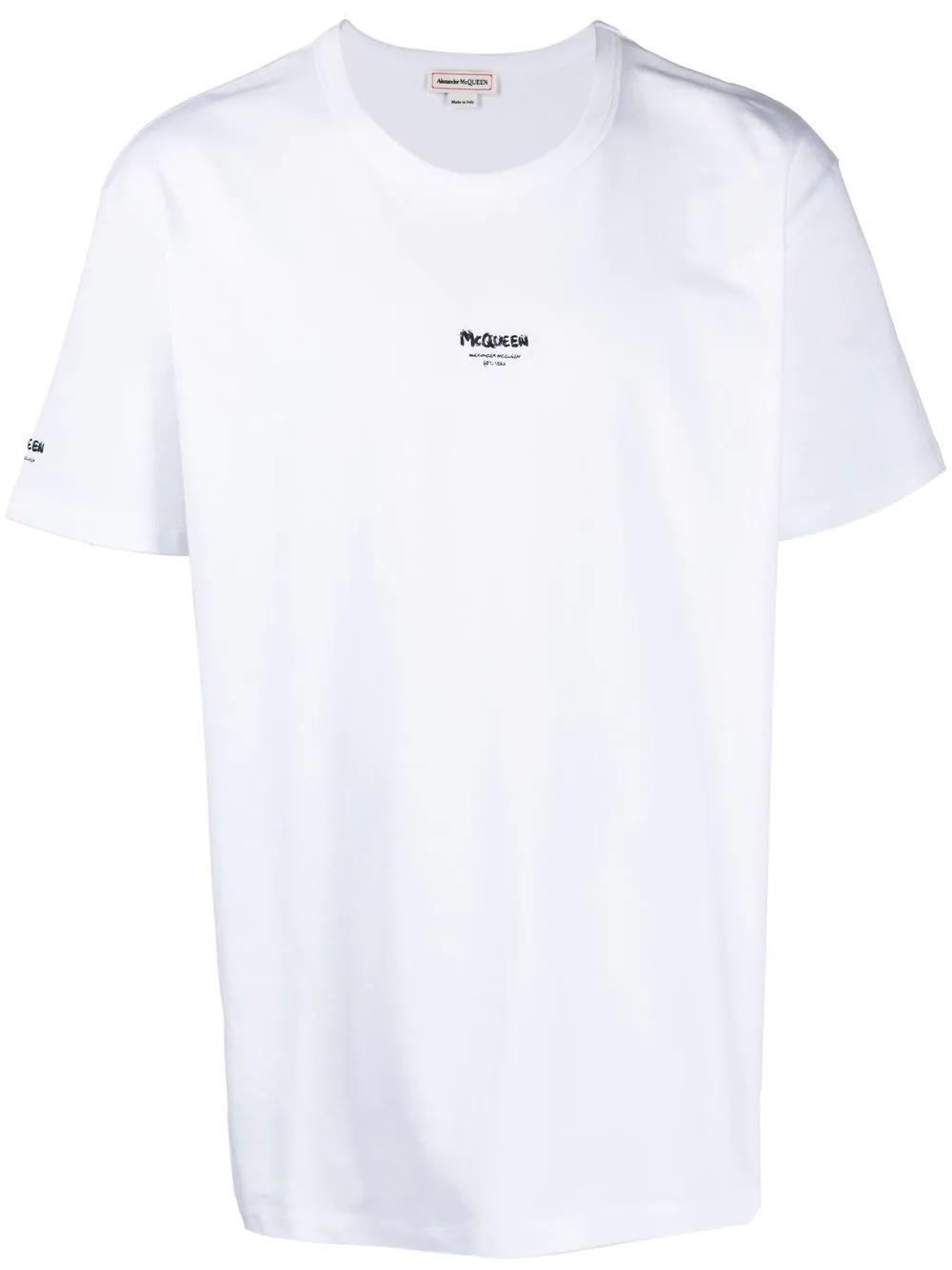 Graffiti Logo short-sleeve T-shirt Established in 1992, Alexander McQueen's name is recognisable in the fashion industry. The brand's iconic Graffiti logo is seen in a contrasting micro version at the chest, sleeve and side of this pure white T-shirt, showcasing their rebellious spirit. Made in Italy Composition Cotton 100%, Viscose 70%, Polyester 30% SIZE & FIT Model measurements Height 6 ft 2 in(1.89 m) Bust/Chest 39.76 in(101 cm) Hips 37.4 in(95 cm) Waist 29.92 in(76 cm) FittingInformation This piece fits true to size. We recommend you get your regular size Cut for a loose fit Made with a mid-weight fabric