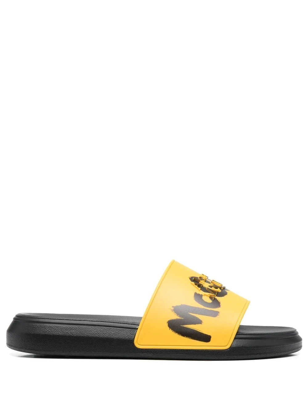 graffiti-logo slip-on slides graffiti-logo slip-on slides from Alexander McQueen featuring black, canary yellow, logo print to the front, raised logo detail, open toe, open back, slip-on style and flat rubber sole. Made in Italy Composition Outer: Rubber 100% Lining: Rubber 100% Sole: Rubber 100% SIZE & FIT Measurement HEEL 1.18 in(3 cm) Sole height 0.78 in(2 cm)