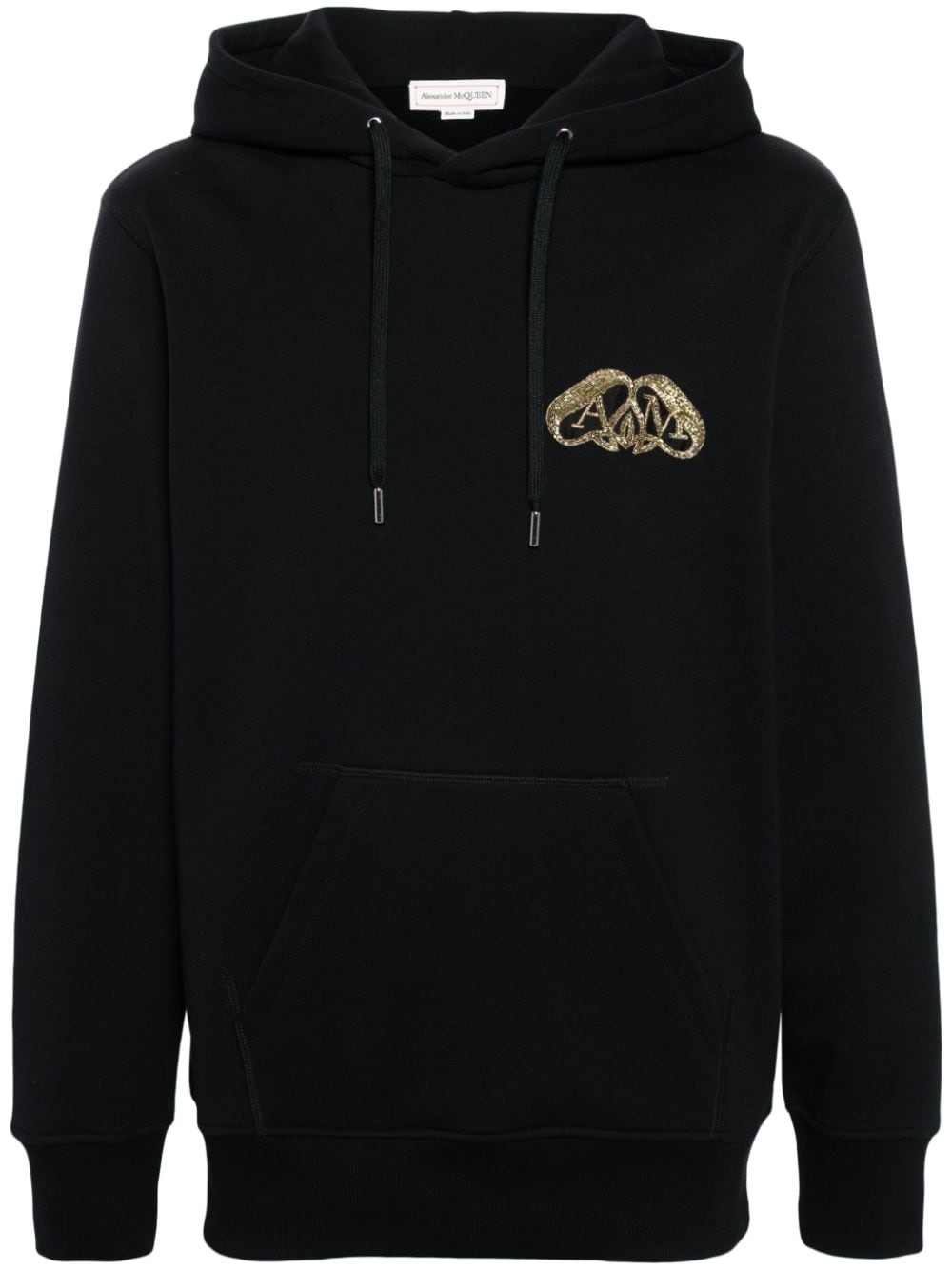 Half Seal Logo cotton hoodie Highlights - Black - Cotton - Jersey texture - Gold hammered half seal logo applique - Drawstring hood - Drop shoulder - Long sleeves - Front pouch pocket - Ribbed cuffs and hem Made in Italy Composition Metallic Fibre 100%, Cotton 100%, Silk 100% SIZE & FIT Model measurements Height 6 ft 2 in(1.87 m) Bust/Chest 38.18 in(97 cm) Hips 36.61 in(93 cm) Waist 29.13 in(74 cm) FittingInformation Designed to be unstructured, offering a loose fit throughout The ribbed hem offers a close, comfortable fit Made from a midweight non-stretch fabric, this piece offers minimal elasticity when worn This piece fits true to size – take your usual size Washing instructions Dry Clean Only