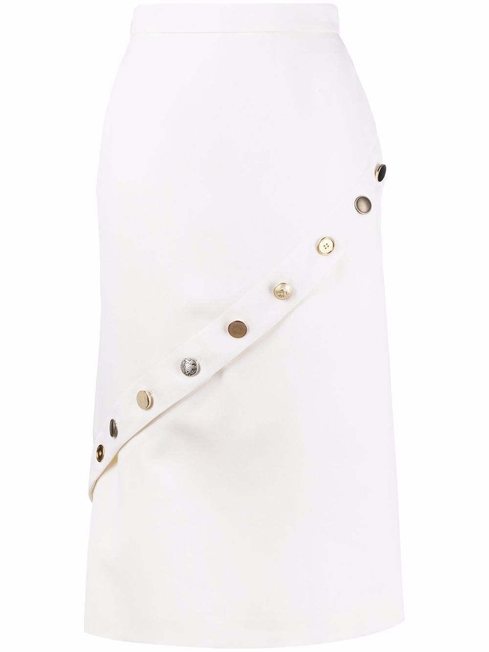 high-waisted asymmetric-hem skirt Alexander McQueen is renowned for creating garments with innovative designs and an impeccably tailored construction. Showcased on this high-waisted skirt, the design features purposeful slit detailing to create an asymmetric hem and decorative buttons across the front. Made in Italy Composition Lining: Acetate 74%, Silk 26% Outer: Wool 100% SIZE & FIT Model measurements Height 5 ft 10 in(1.77 m) Bust/Chest 32.28 in(82 cm) Hips 35.03 in(89 cm) Waist 25.19 in(64 cm) FittingInformation This piece fits true to size. We recommend you get your regular size Designed to be fitted at the waist and hips, loose over the leg Made with a mid-weight non-stretch fabric Washing instructions Dry Clean Only