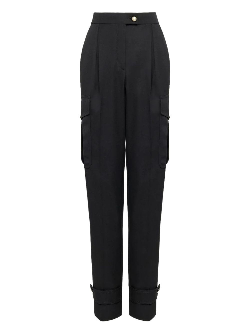 high-waisted wool trousers Exhibiting a high-waisted tapered-leg silhouette, these Alexander McQueen trousers are produced in a tonal wool fabrication. A sharply pressed crease completes the sleek design. Highlights - Black - Wool - Embossed gold-tone buttons - Pleat detailing - Strap detailing at the cuffs - Two diagonal pockets to the sides - Two side cargo pockets - Rear welt pocket - High-rise - Front button and zip fastening Made in Italy Composition Lining: Cupro 100% Outer: Wool 100% SIZE & FIT FittingInformation Designed for a tapered fit, these trousers allow for a close fit at the waist and a loose unrestricted fit over the leg with a closer fit towards the ankle Made from a midweight non-stretch fabric This piece fits true to size – take your usual size Washing instructions Dry Clean Only