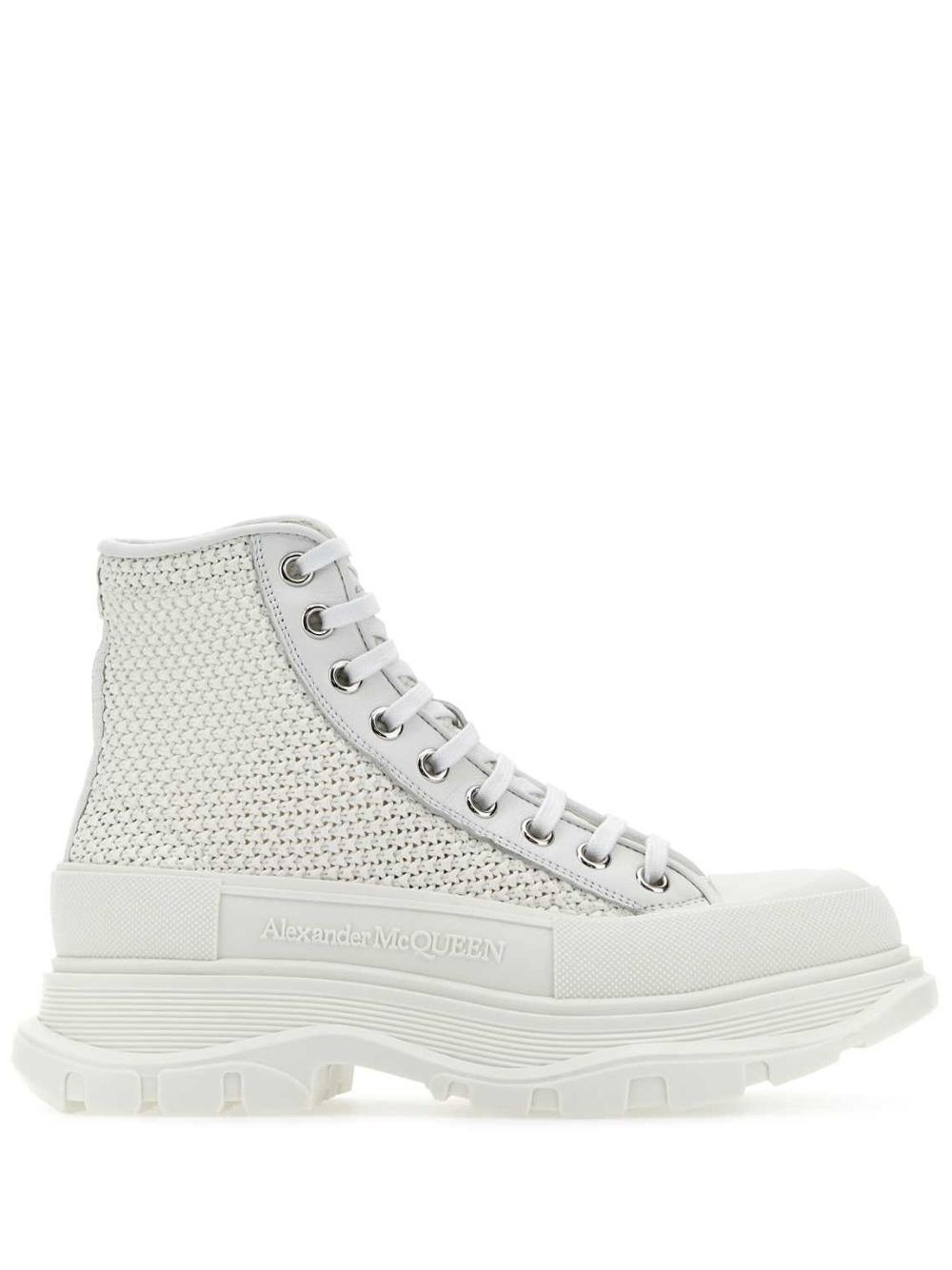 interwoven-design boots Constructed in an interwoven tonal design, these white boots from Alexander McQueen are made in Italy. They feature the signature chunky sole, adorned with an embossed logo. Highlights - White - Interwoven design - Embossed logo to the side - Round toe - Front lace-up fastening - Chunky rubber sole Made in Italy Composition Outer: Fabric 100% Lining: Fabric 100%, Leather 100% Sole: Rubber 100%