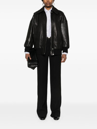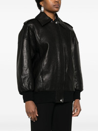 leather bomber jacket Highlights - Black - Calf leather - Classic collar - Epaulettes - Long sleeves - Two side inset pockets - Ribbed cuffs and hem - Full lining - Concealed front zip fastening Made in Italy Composition Outer: Calf Leather 100%, Lambskin 100%, Wool 89%, Polyamide 9%, Elastane 2% Lining: Cupro 100%, Polyethylene 60%, Polyester 40% SIZE & FIT Model measurements Height 5 ft 11 in(1.8 m) Bust/Chest 31.49 in(80 cm) Hips 36.61 in(93 cm) Waist 24.4 in(62 cm) FittingInformation Designed to be unstructured, offering a loose fit throughout The ribbed hem offers a close, comfortable fit Firm leather offering little flexibility to maintain its durability and sturdiness This piece fits true to size – take your usual size