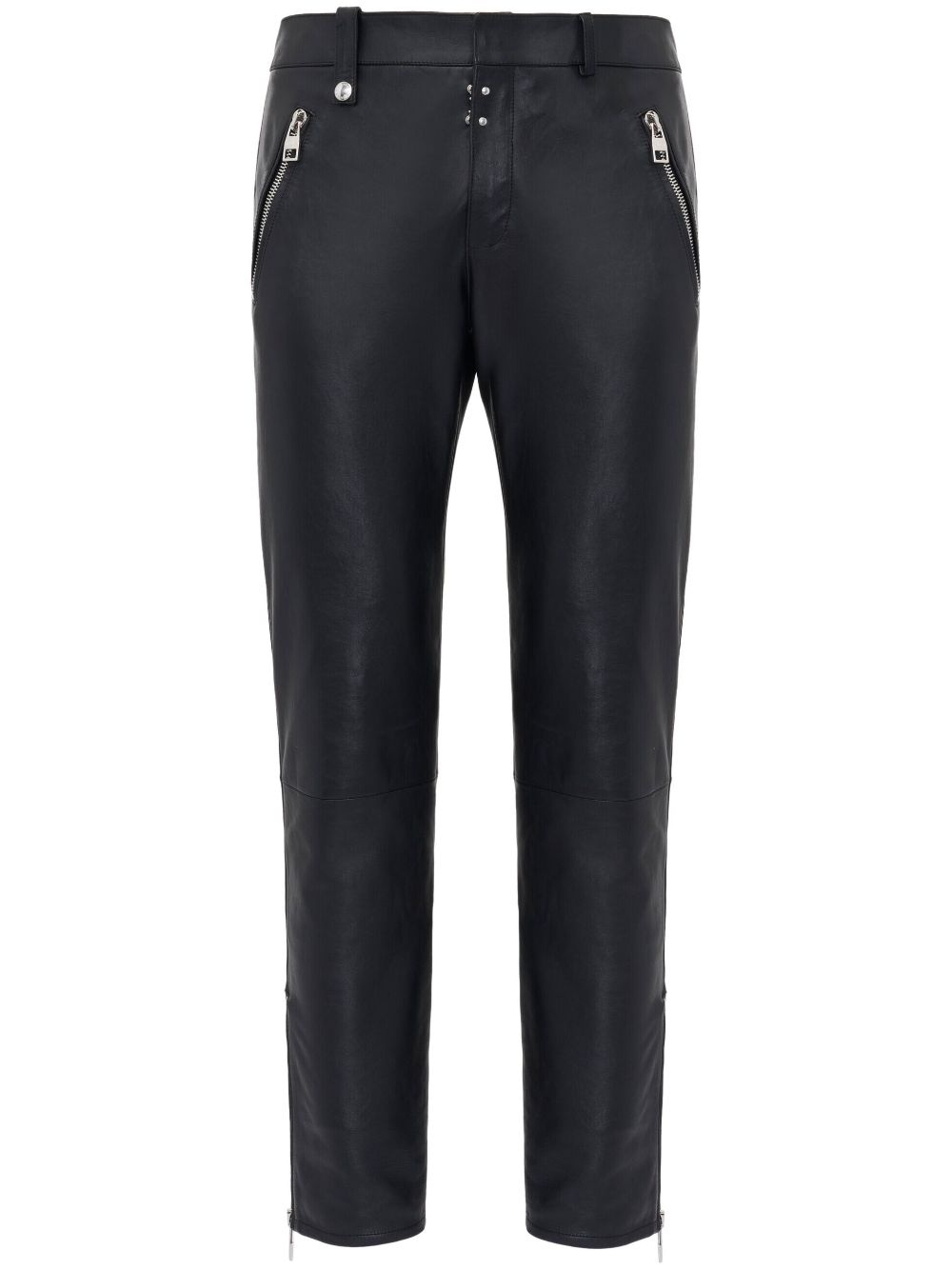 leather cropped slim-fit trousers Made from supple calf leather in Italy, these mid-rise trousers from Alexander McQueen are cut to a slim silhouette and elevated with silver-tone hardware and side-zipped pockets for an industrial-inspired appeal. Highlights - Black - Calf leather - Mid-rise - Concealed front fastening - Belt loops - Two side zip-fastening pockets - Slim cut - Cropped leg Made in Italy Composition Calf Leather 100%
