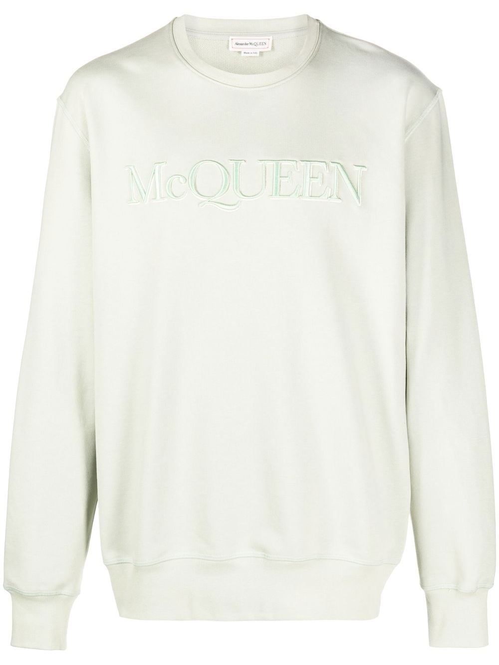 logo-embroidered sweatshirt Rendered in a pale shade of green, this cotton sweatshirt certainly shows your alliance to Alexander McQueen. Styled with drop shoulders and ribbed trims, its front is embroidered with the label's moniker in tonal lettering. Highlights - Light green - Cotton - Crew neck - Drop shoulder - Long sleeves - Ribbed trim - Straight hem Made in Italy Composition Cotton 100% SIZE & FIT Model measurements Height 6 ft 1 in(1.85 m) Bust/Chest 35.82 in(91 cm) Hips 37.79 in(96 cm) Waist 29.13 in(74 cm) FittingInformation This piece fits true to size. We recommend you get your regular size Cut for a loose fit Made with a mid-weight fabric