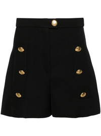 logo-engraved buttons shorts These Alexander McQueen shorts are cut in Italy from black wool to a high waist and wide-leg style. They're completed with polished gold-tone buttons on the front that proudly display the house's signature Seal logo. Highlights - Black - Wool - Pressed crease - Two side inset pockets - Two rear welt pockets - Thigh-length - Straight hem - Logo-engraved gold-tone hardware - Front button and zip fastening Made in Italy Composition Outer: Wool 100% Lining: Cupro 100% SIZE & FIT Model measurements Height 5 ft 10 in(1.77 m) Bust/Chest 33.07 in(84 cm) Hips 37 in(94 cm) Waist 24.8 in(63 cm) FittingInformation Designed for a relaxed, roomy fit Made from a midweight non-stretch fabric This piece fits true to size – take your usual size Washing instructions Dry Clean Only