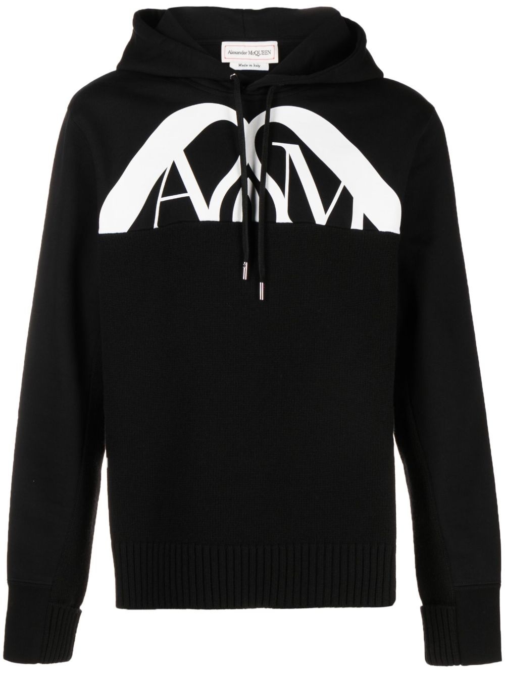 logo-print cotton hoodie Cut from cotton, this long-sleeve, drawstring hoodie from Alexander McQueen spotlights a logo print to the front. Highlights - Black/white - Cotton - Logo print to the front - Drawstring hood - Long sleeves Made in Italy Composition Cotton 100%, Wool 100% SIZE & FIT Model measurements Height 6 ft 2 in(1.87 m) Bust/Chest 38.18 in(97 cm) Hips 36.61 in(93 cm) Waist 29.13 in(74 cm) FittingInformation Designed for a relaxed fit, this piece allows for comfort and movement when worn Made from a midweight non-stretch fabric, this piece offers minimal elasticity when worn This piece fits true to size – take your usual size Washing instructions Machine Wash