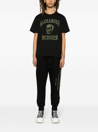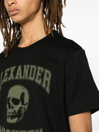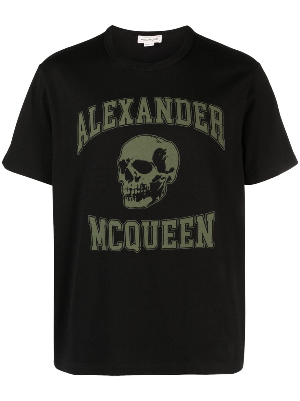 logo-print cotton T-shirt Memento mori are a longstanding Alexander McQueen trope that dates to the founder’s graduate collection. This black cotton T-shirt continues that legacy with the skull print at the front – it’s framed by the brand’s moniker in collegiate lettering. Highlights - Black - Cotton - Jersey texture - Logo print to the front - Skull print to the front - Crew neck - Short sleeves - Ribbed cuffs and hem - Straight hem Made in Italy Composition Cotton 100% SIZE & FIT Model measurements Height 6 ft 2 in(1.88 m) Bust/Chest 35.43 in(90 cm) Hips 36.61 in(93 cm) Waist 27.95 in(71 cm) Measurement CHEST 41.33 in(105 cm) SLEEVE LENGTH 16.73 in(42.5 cm) Shoulder Width 17.71 in(45 cm) FittingInformation Designed for a relaxed fit, this piece allows for comfort and movement when worn Made from a midweight non-stretch fabric, this piece offers minimal elasticity when worn This piece fits true to size – take your usual size Washing instructions Machine Wash